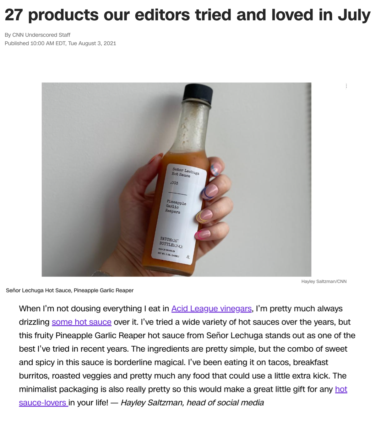 “When I'm not dousing everything I eat in Acid League vinegars, I'm pretty much always drizzling some hot sauce over it. I've tried a wide variety of hot sauces over the years, but this fruity Pineapple Garlic Reaper hot sauce from Señor Lechuga stands out as one of the best I've tried in recent years. The ingredients are pretty simple, but the combo of sweet and spicy in this sauce is borderline magical. I've been eating it on tacos, breakfast burritos, roasted veggies and pretty much any food that could use a little extra kick. The minimalist packaging is also really pretty, so this would make a great little gift for any hot sauce lovers in your life! — Hayley Saltzman, head of social media”