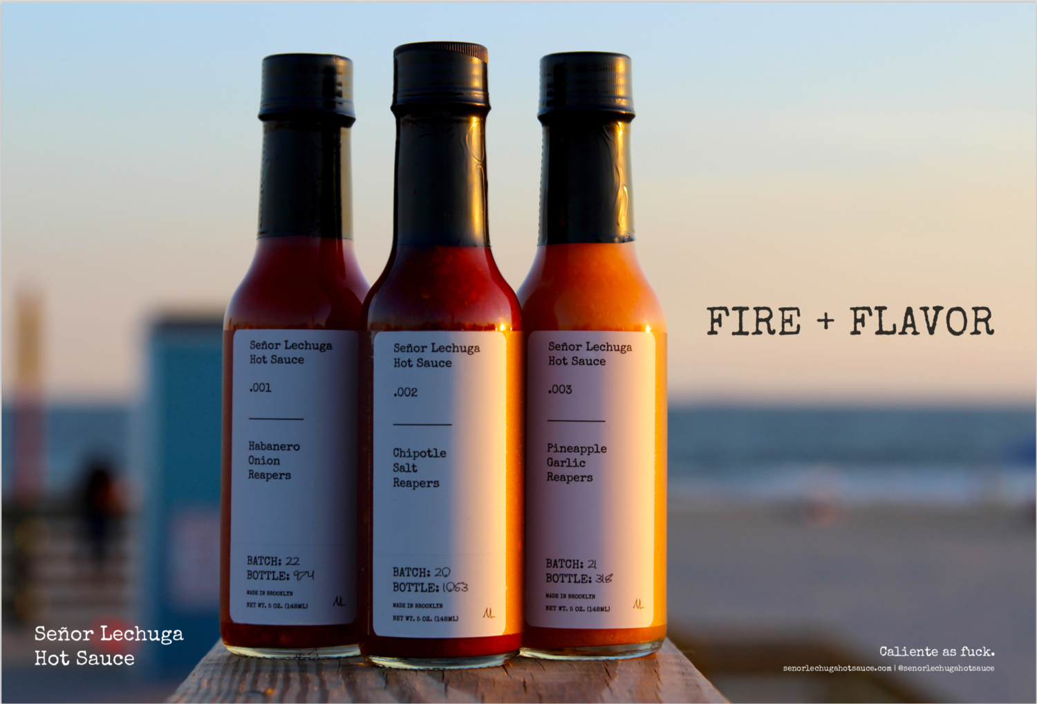 “The three best friends that anybody could have! This trio of original Señor Lechuga Hot Sauce bottles will meet and exceed all of your heat and flavor needs. Flavors in this trio include Chipotle Salt Reapers, Pineapple Garlic Reapers and Habanero Onion Reapers. Made in Brooklyn.”