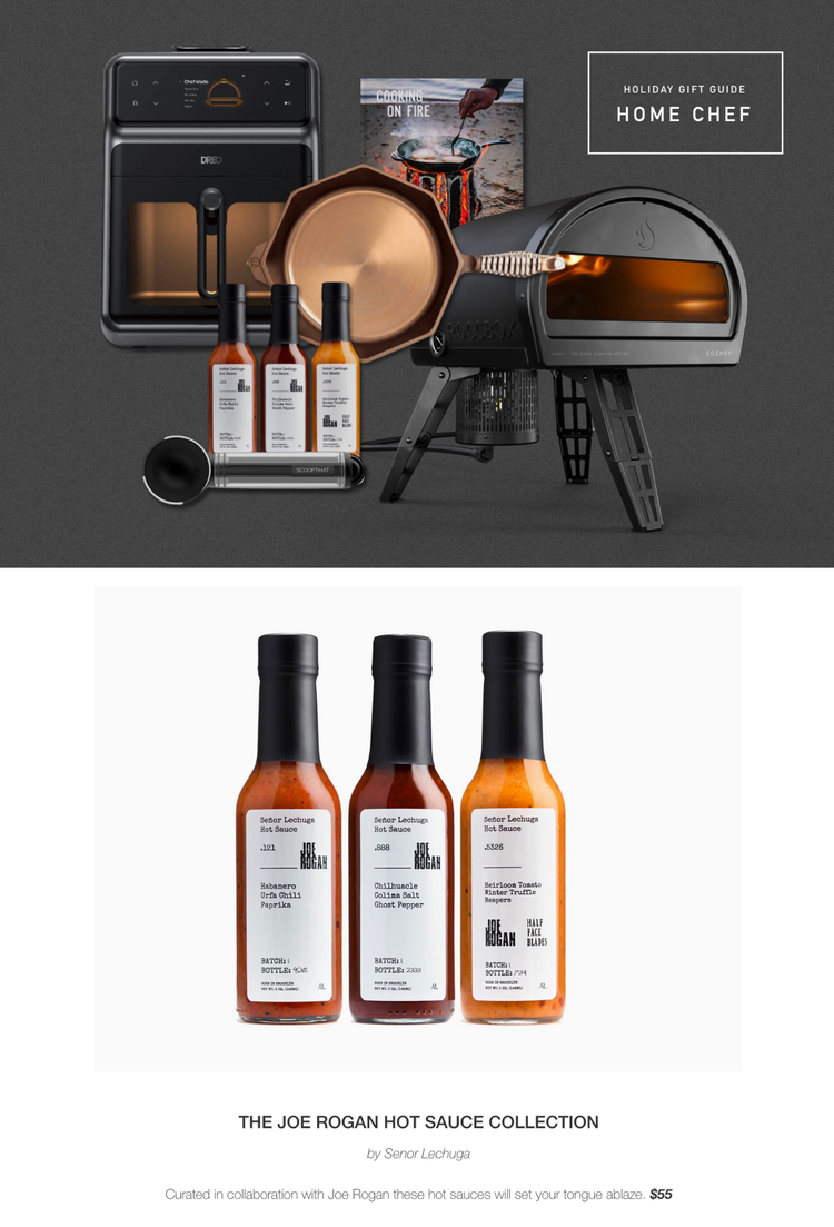 “The Senor Lechuga Joe Rogan Hot Sauce Collection was created via a partnership between the podcaster, fight commentator, and comedian and the Brooklyn-based husband and wife team that comprise Senor Lechuga in which Rogan was able to curate a selection of his favorite hot sauces, bringing flavor as well as a lot of heat.”